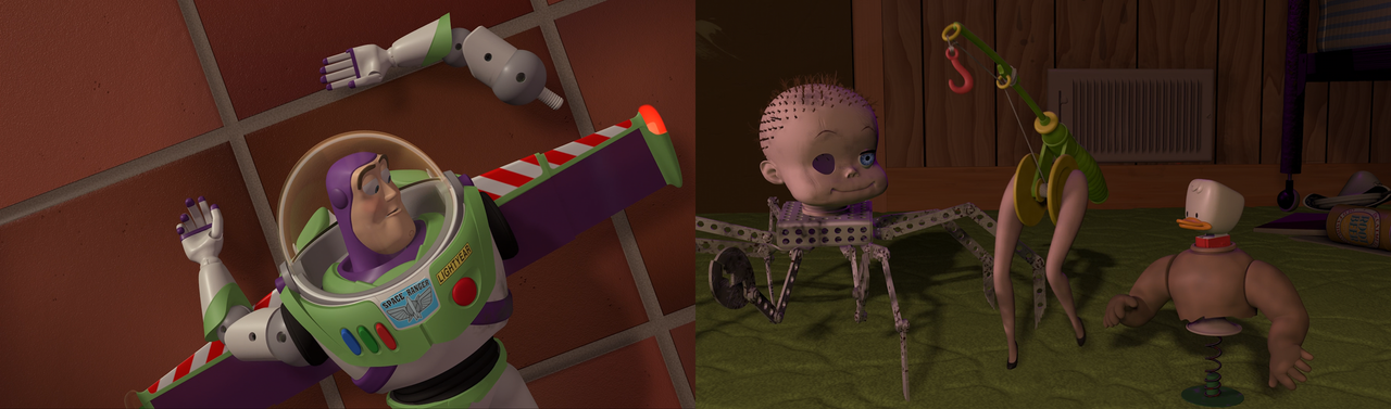 Жуткость анимационного присутствует всегда, так как анимация — это одушевление неодушевленного. «История игрушек», а точнее ее персонажи основаны на этом концепте: игрушки ведут себя как люди. Однако фильм не просто оживляет игрушки, но и возвращает их обратно в состояние неодушевленного, из-за чего и проявляется жуткая сущность анимации. И она даже используется как часть сюжета: чтобы проучить хулигана.