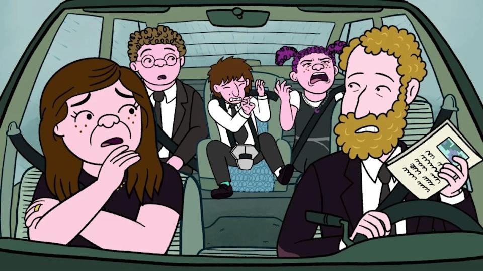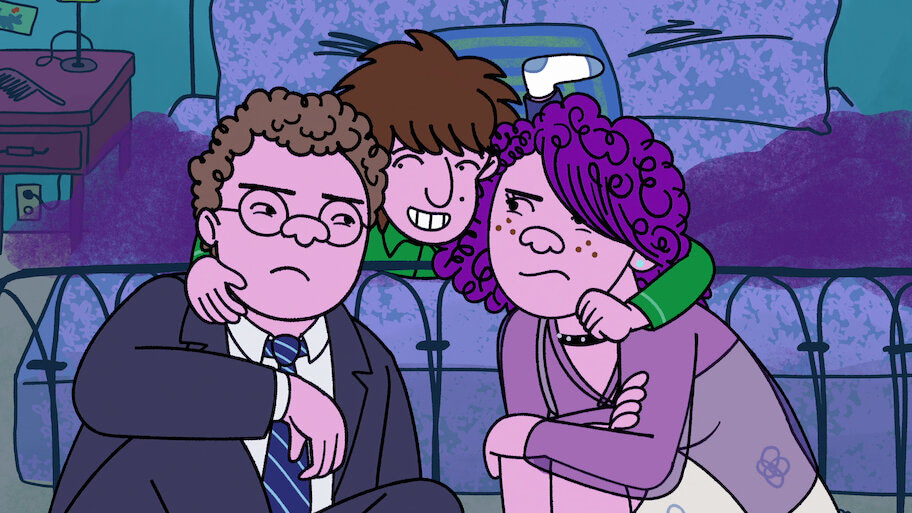 Стиль анимации тоже прост. Герои выглядят примерно одинаково, хотя в повествовании их возраст постоянно меняется. Фон часто статичен, не детализирован. Окружающие люди почти не прорисованы и выглядят, как карикатуры. Все это создает иллюзию того, что мы смотрим не просто мультсериал, а чьи-то воспоминания. Мы редко можем заметить изменения в своем лице, приходящие с возрастом, потому что каждый день смотрим на себя в зеркало — отсюда статичность в рисовке героев. А наши воспоминания фокусируются на нас и людях рядом, поэтому деталей окружающего мира во фреймах не так уж и много.