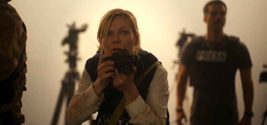 О чем же рассказывает картина, и удалось ли режиссёру освободиться от клише жанра? Действие фильма разворачивается в ближайшем будущем, в котором Америка охвачена Гражданской войной. Подробности этих событий нам не раскрываются, а фокус внимания смещается на известную фотожурналистику Ли Смит, которая решает отправиться в самое пекло боевых действий, чтобы сделать отличные снимки и взять интервью у президента. Кирстен Данст идеально подошла на эту роль, сыграв женщину в возрасте, которая охвачена ПТСР после множества ужасов, увиденных за карьеру. Тут можно отметить забавную параллель с героиней «Меланхолии», сыгранной той же Кристен. Только вот у Ларса Фон Триера девушка не пытается бороться со своими страхами и тревогами, а становится их рабыней, в отличие от журналистки Ли Смит, которой удается черпать в трудностях силы для продолжения работы.