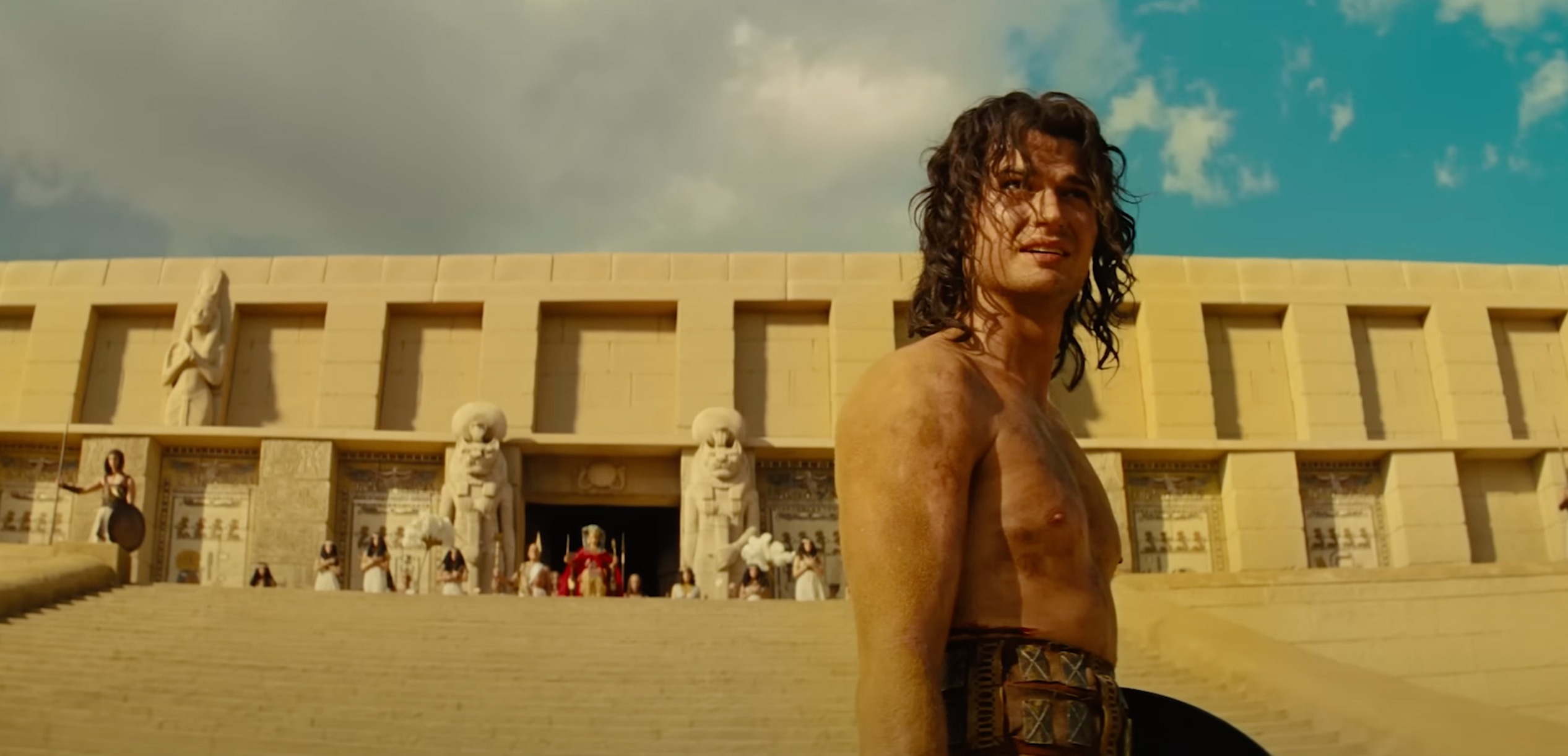 Фильм начинался весьма живо, и, несмотря на 2 часа хронометража, картина не монотонна. Она насыщена и полна, иногда сатирична, но порой все это чересчур. В павильоне в нашу смену снимают фильм о женщине-фараоне, тут и Джо Кири, немного отдающий молодым Бренданом Фрейзером — этакий «химбо» в египетских декорациях. Также очень к месту постановочное клише драки героя: искупавшись в грязи и крови, он получает экзотичную красотку и свободу, после сражения врага, камера облетает вокруг Локвуда. Вот он — фильм выходного дня, американское кино. После этого мы четко видим всю иерархичность, цену славы, жестокость и грязь закулисья прекрасного мира. Так и герой Кири чуть ли не обожествляет Жозефину (Лили Джеймс): она выше его по статусу и роли и она нужна ему.